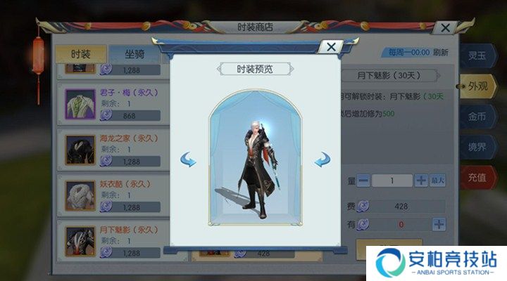 月下魅影时装不仅外观帅气令人感觉大气上档次,还可以增加玩家500点的修为,所以许多玩家都想要获得这款时装。点击前往获取按钮可以发现只能在时装商店购买。只要1288就能够获得永久的月下魅影时装了。在所有的时装外形中,月下魅影属于那种很帅气很潮流的那种时装。