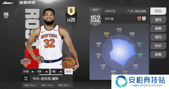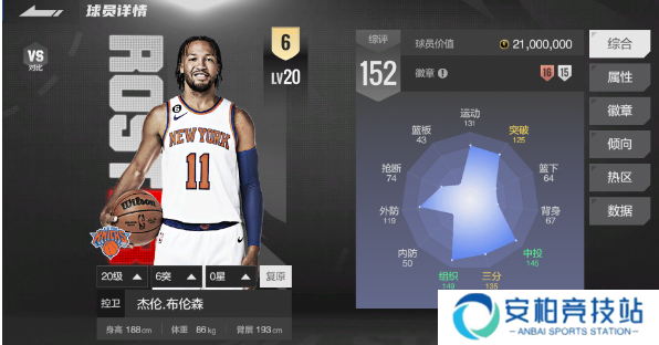 布伦森作为如今尼克斯的老大,在游戏中的能力也比较突出。拥有优异的组织能力,传球助攻对他来说易如反掌。145的中投以及135的三分能力,搭配他齐全的投射徽章,使他实战中投射能力也非常稳定。对比西部全明星PG库里,布伦森性价比更高,是一位亲民的组三球员选择。