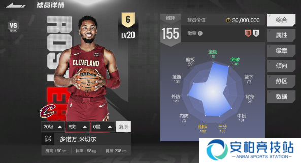 作为新一代骑士的领军人物,米切尔在游戏中同样拥有极强的得分能力。现实中米切尔能投善扣的特点在游戏中完美复现,极强的运动能力搭配他的突破扣篮数值,实战中经常上演隔人暴扣。而合格的投射能力,在外线的投射也极具威胁。可以说米切尔是游戏中最容易上手的矮个子进攻球员,玩起来非常有爽感。