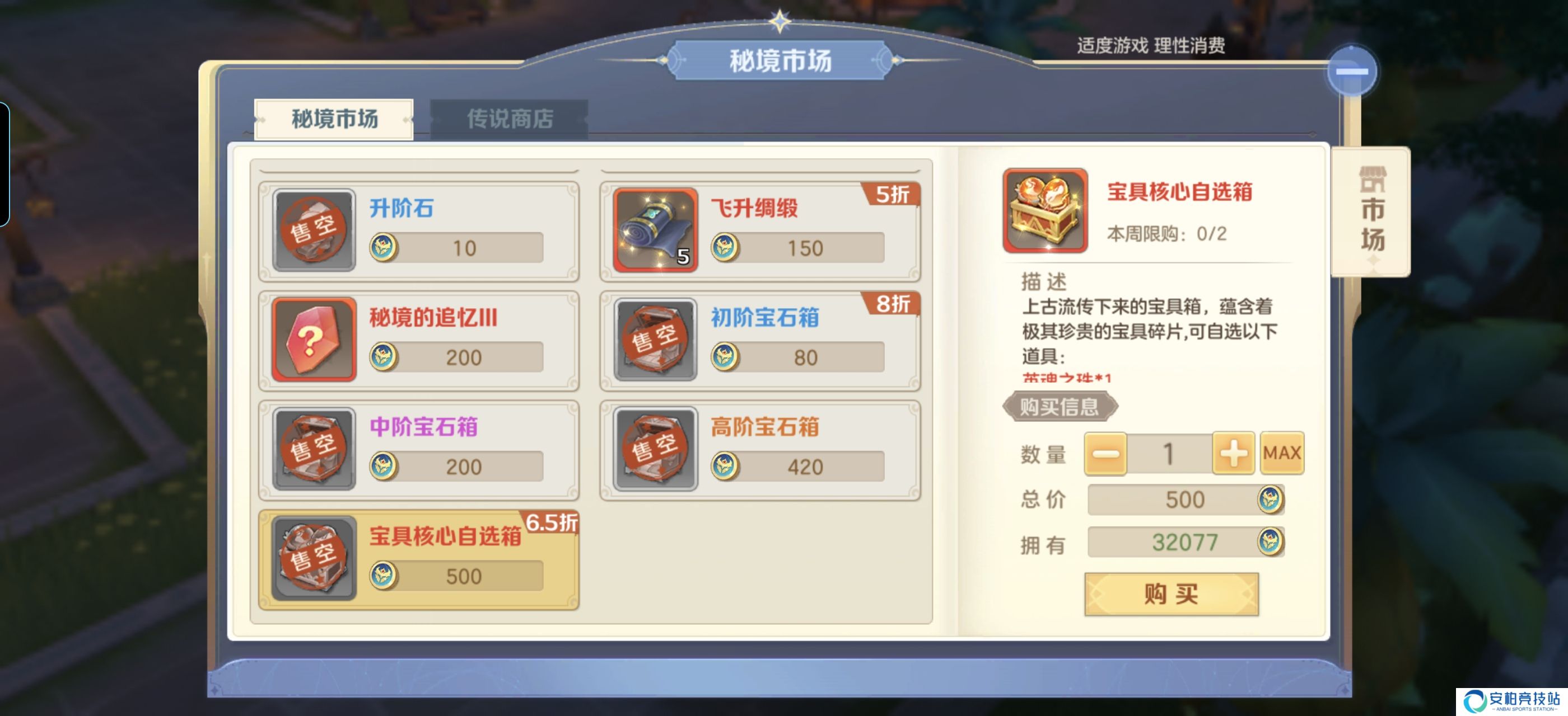 秘境市场里面优先拉满宝石箱子核心自选,这是平民玩家宝具核心资源的唯一来源,宝石基本就在这里兑换,除此以外就靠大秘境随机爆出。