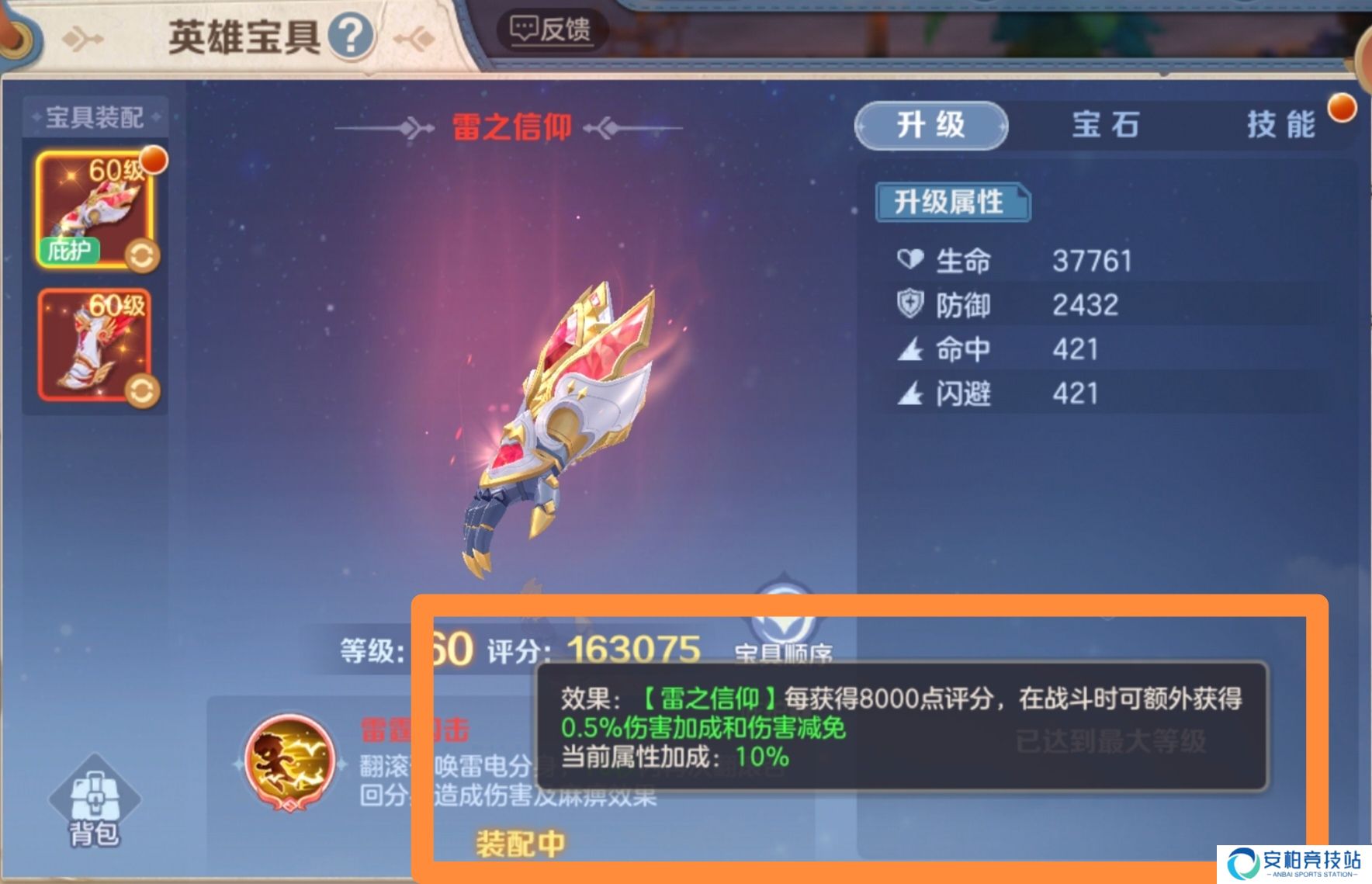 目前宝具有雷之信仰和风之意志两种,养成宝具第一步就是宝具升级,宝具升级的主要目的是提升宝具的升级基础属性,雷之信仰主要是提升命中闪避,风之意志主要是提升暴击抗暴,这两个宝具升级优先侧重提升雷之信仰为主,风之意志为辅,两个宝具等级同时提升。