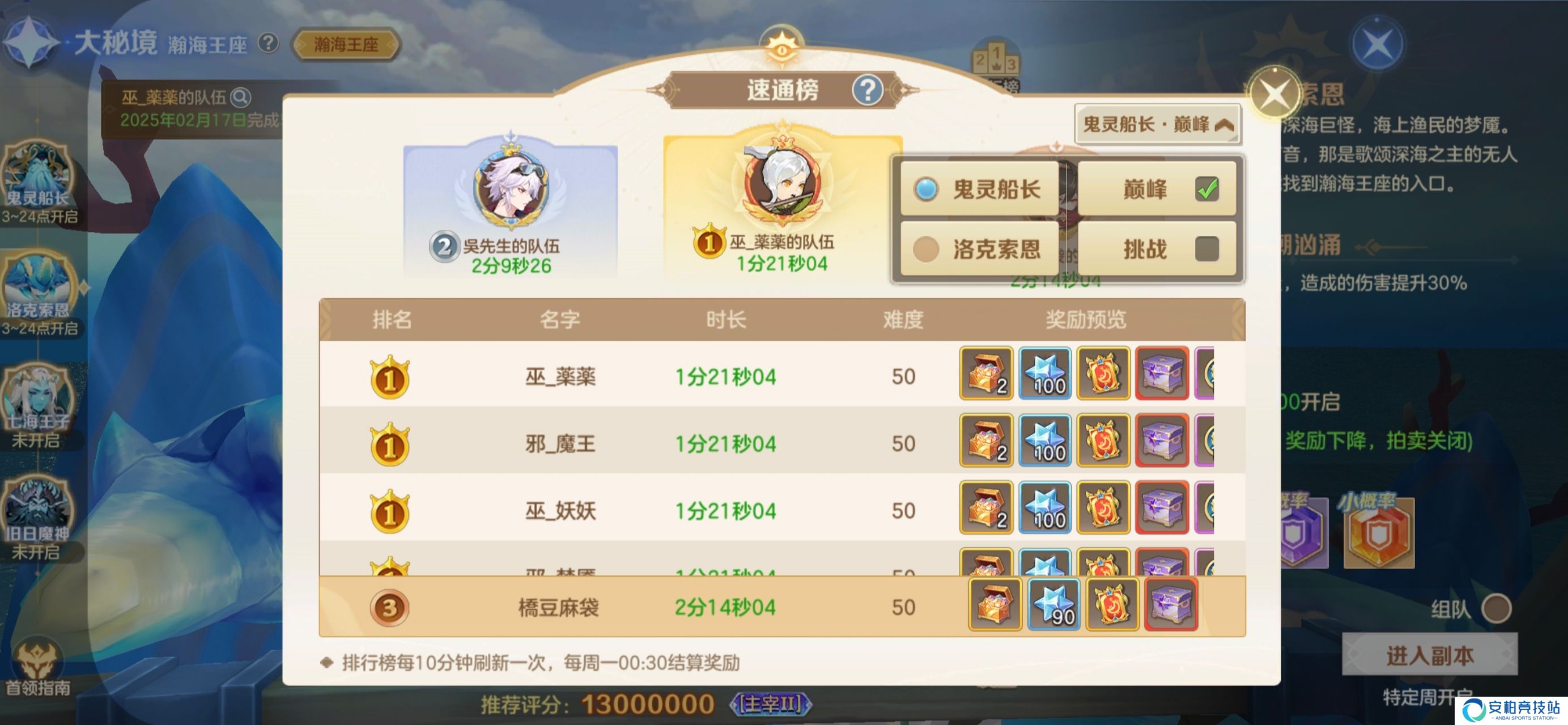 每周大秘境有速通榜,新区小伙伴如果秘境队伍能打最高难度排名的实力就打最高难度,争夺巅峰榜第一有两个橙色宝石箱子,如果实力不足以争夺巅峰榜第一,就放弃打最高难度,打最高难度低一级的最好,抢挑战榜第一,有三个紫色宝石箱子比巅峰榜拿一个箱子要好一些。