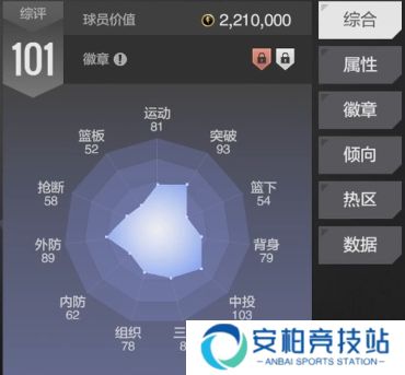然而在防守方面,塔图姆却展现出了另一番风采,无论是外防还是内防,他都表现得相当稳定,特别是他的外防数值高达89分,这让他能够在防守对方外线球员时游刃有余,而内防数值也有62分,虽然不算顶级,但也能在一定程度上抵御对方内线球员的冲击,相比内防而言塔图姆在外防方面更为擅长,因此在使用他进行比赛时,大家需要特别注意他的站位和防守策略,充分发挥他的外防优势。