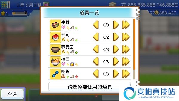 开了装备店后就可以买道具了,道具都是三个一份很便宜,同样的道具每次购买会提升一些价格。打比赛也会送道具,提升属性,提升斗志,控制体重和恢复,都靠道具。