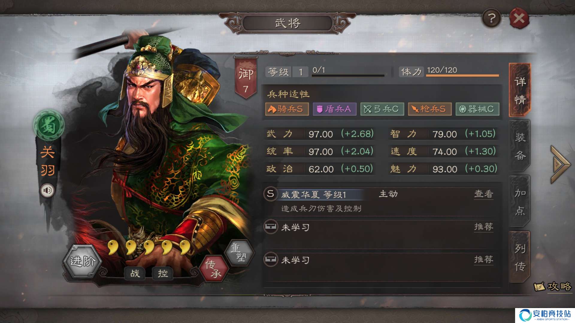 (副将)关羽,战法搭配:破阵摧坚+横扫千军