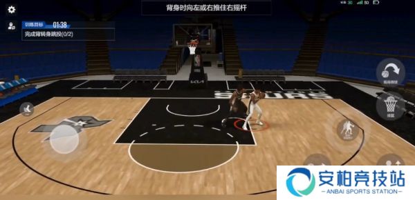 当完成这一系列操作后,球员会做出一个极为突然的转身动作,这个时候迅速调回方向键,并松开运球键,紧接着直接按下投篮键,这样就能流畅地做出背打投篮动作,从而达成任务要求,顺利完成背身训练任务。