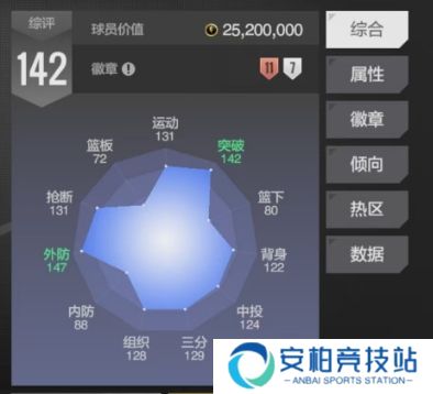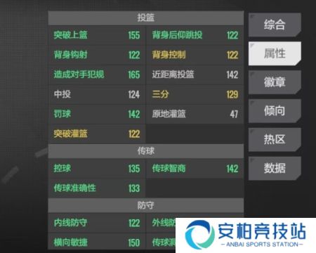 在属性达到20级6突的时候,他的各项数据更是亮眼,其中突破上蓝的能力值达到了155,这意味着他在突破到篮下时的上篮成功率相当可观,背身后仰跳投的能力值为122,这显示了他在进行背身单打时的后仰跳投技巧,很难被对手封盖,中投能力值达到了124,说明他在中距离区域的投篮命中率较高,是一个可靠的中距离射手,三分球能力值也有129,这表明他在外线也具备一定的三分远投能力,能够为球队拉开空间。