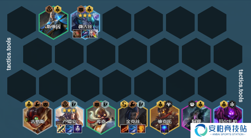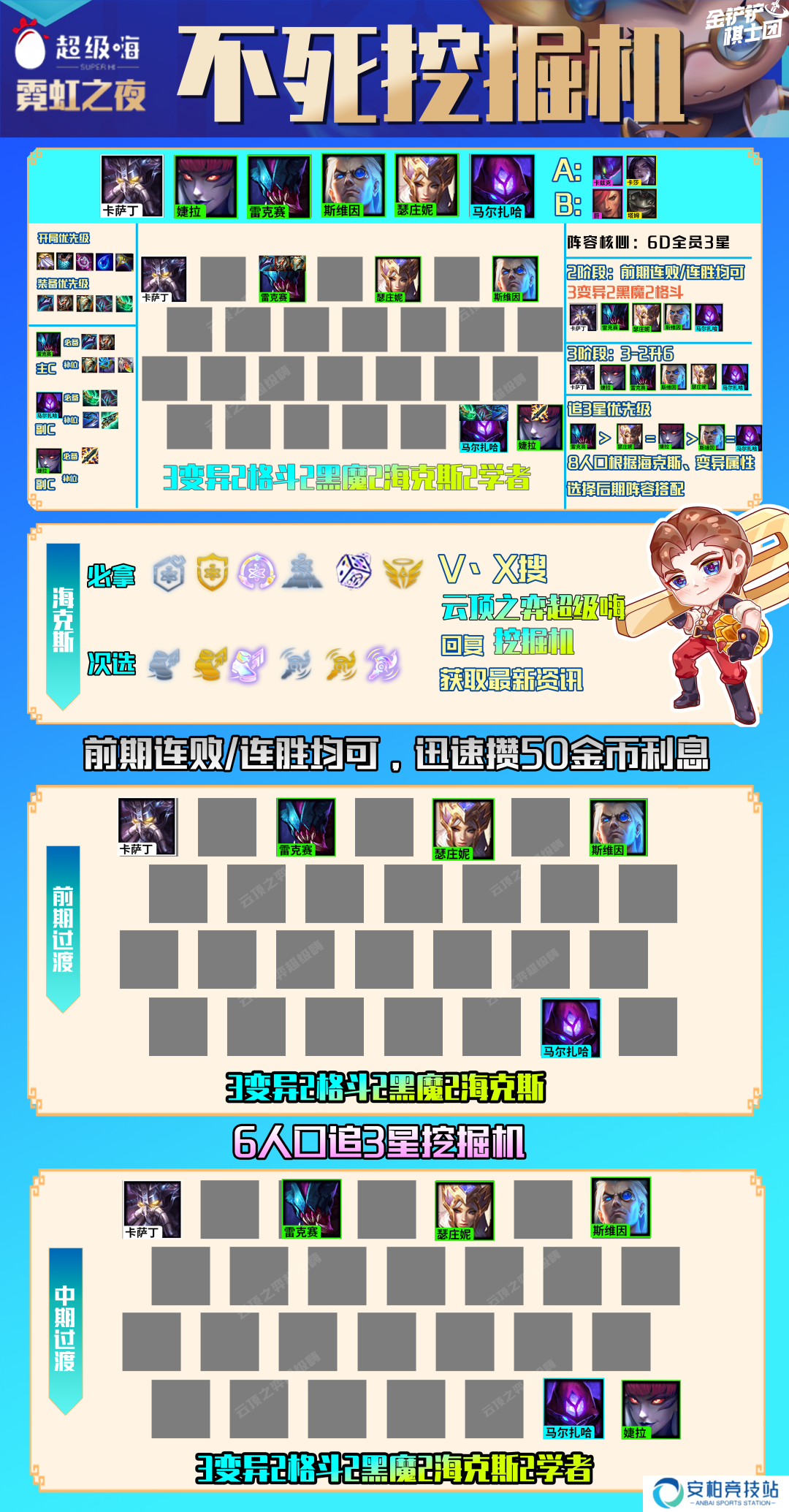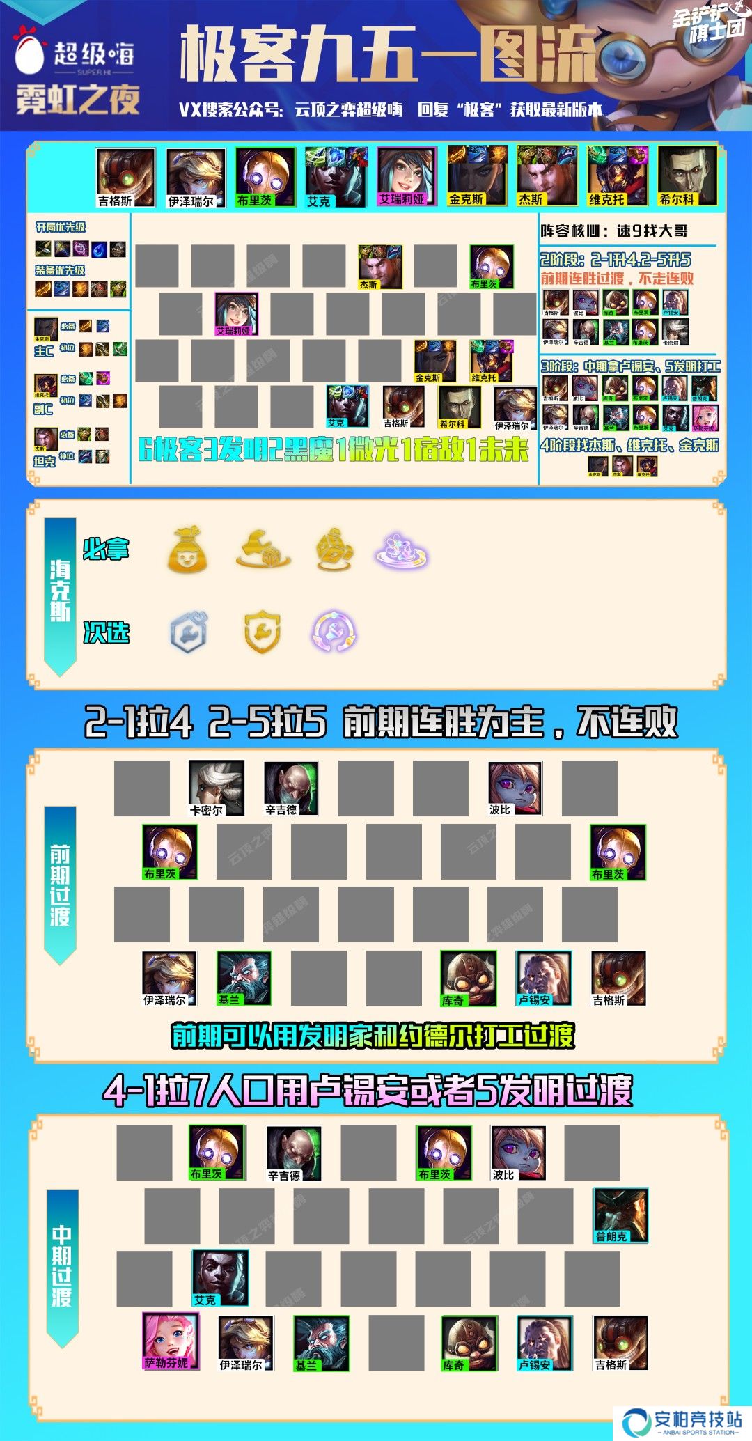前言:最近版本又一次优化,更新包括一些海克斯和英雄,版本人热门阵容又一次发生变化,经过半天的挖掘,版本当前强势阵容有极客九五、白魔赛娜、VIP火男、极客强袭、挖掘机、黑魔枪。下面小嗨分别对当前热门阵容依次分析: