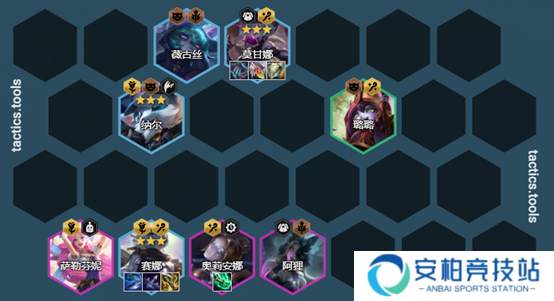 阵容组成:璐璐、薇古丝、莫甘娜、纳尔、萨勒芬妮、奥利安娜、阿狸、赛娜