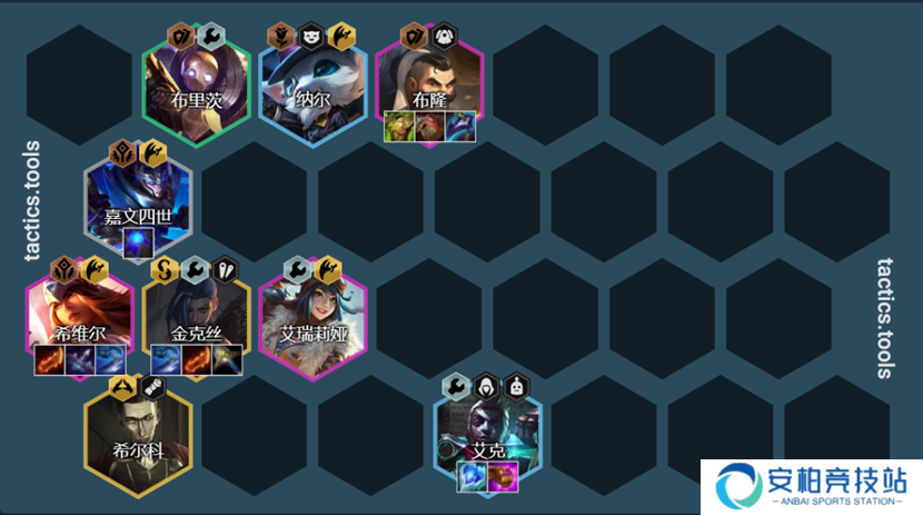 阵容组成:希维尔、嘉文四世、布里茨、纳尔、艾克、布隆、艾瑞莉娅、金克丝、希尔科(9人口)阵容羁绊:4极客4强袭2保镖2海克斯1微光1宿敌1名流海克斯强化(必拿):+1/2极客、+1/2强袭战士、古代档案、+1/2保镖、妙手空空、废品场海克斯强化(次选):二进制空投、星界赐福、狩猎律动、直击弱点、金色赠礼、组件百宝袋、藏宝库