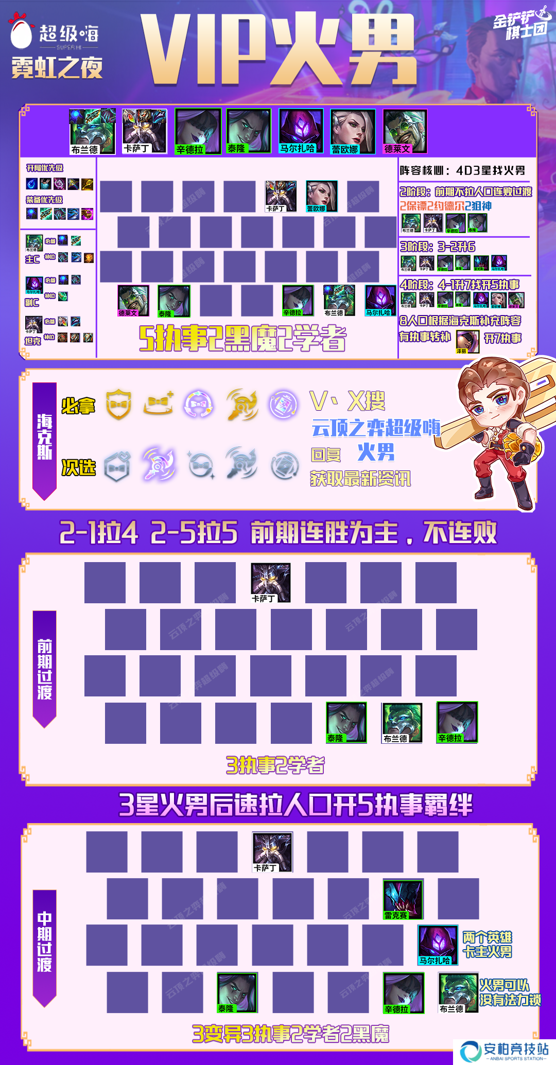 阵容羁绊:5执事2黑魔法师2学者海克斯强化(必拿):执事之心 执事之徽 执事之冕 魅力难挡 超级VIP古代档案海克斯强化(次选):DD街区 好事成双 便携锻炉 代谢加速器 小巨人