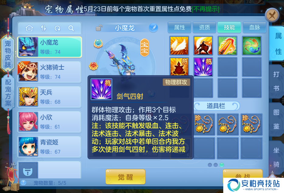 新手推荐打造剑气群攻宠(性价比最高),典型技能组合: