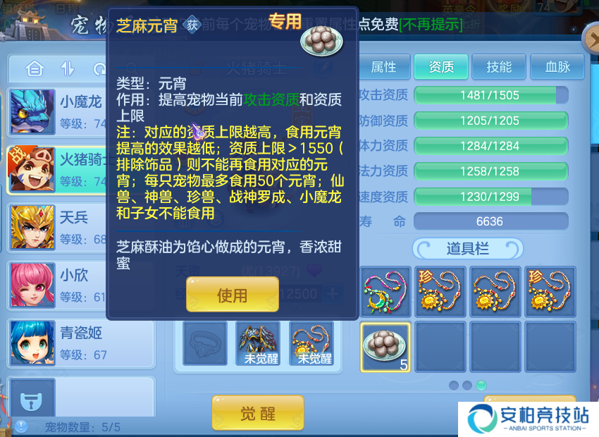 每只宠物最多食用50个,建议单项资质≤1450时优先补充