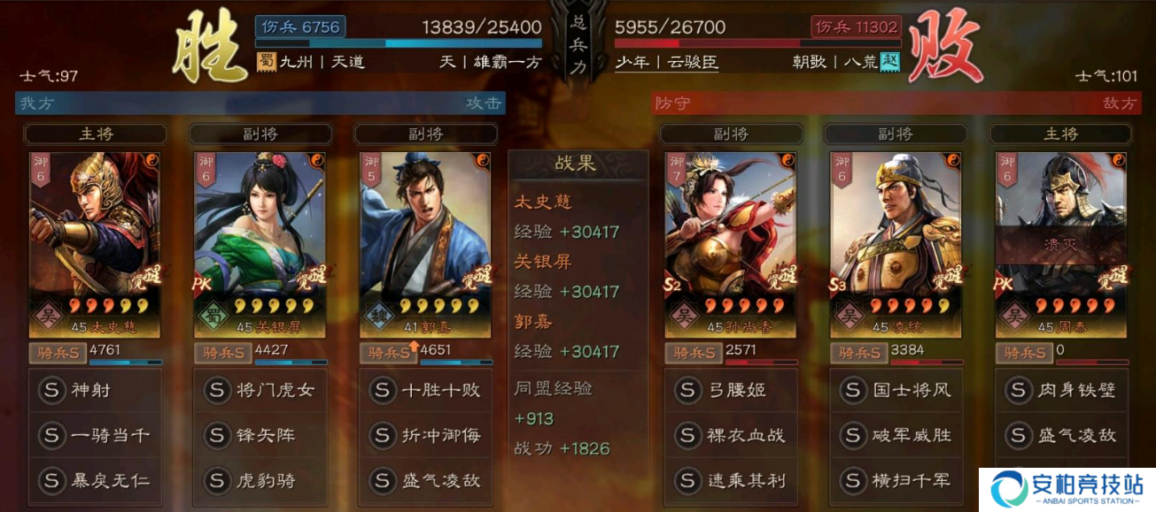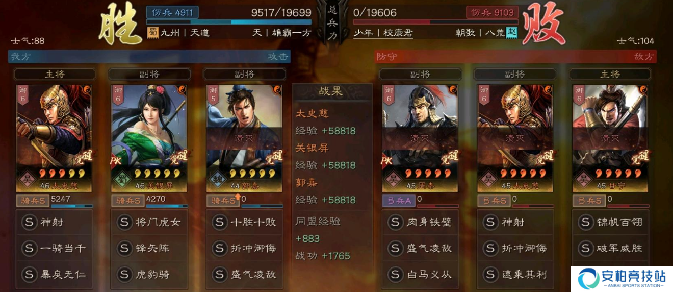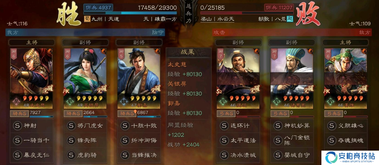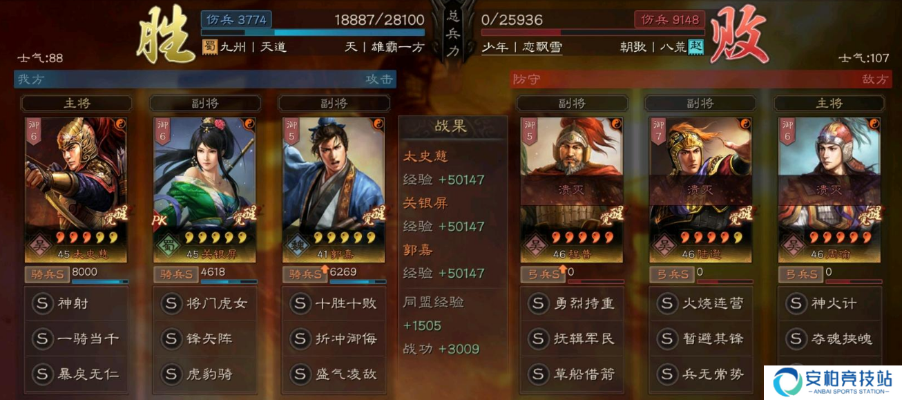 总结:这个队伍关妹和郭嘉纯白板,太史慈的话如果有个三红水平就能玩,战法方面也不难凑齐,到了PK赛季基本上抽到关妹就能组出这套阵容!