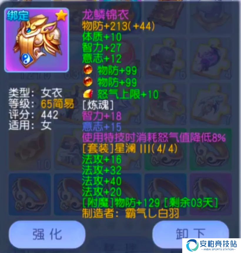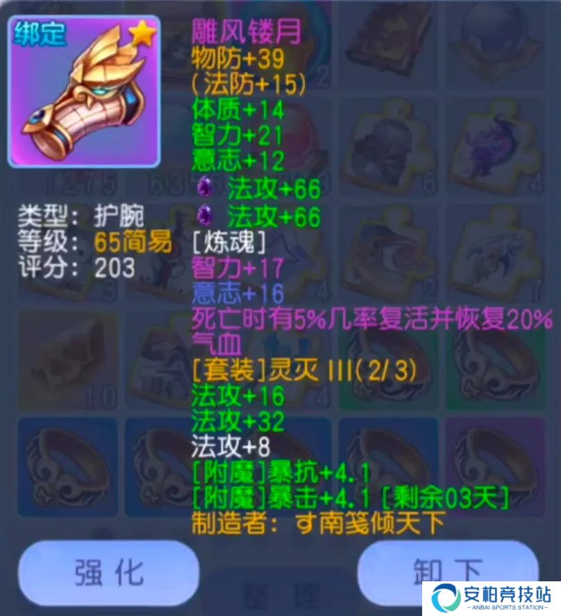 炼魂属性:炼魂方面,智力和意志的组合分别是17和16!属性稍微低了一些,特效的话选择的是神佑,5%的概率也不算很高,建议再洗一洗!