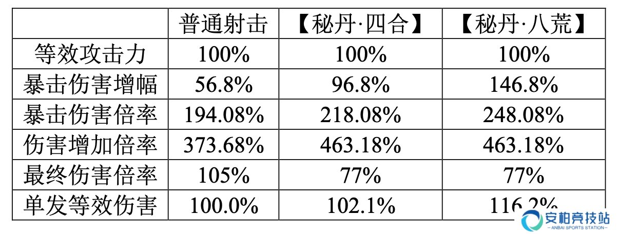 由此可见,【卜卜·小天师】在长期输出情况下,普通射击和【秘丹·四合】伤害中的暴击伤害增幅相比于【秘丹·八荒】更低,反而暴击伤害词条对普通射击和【秘丹·四合】的暴击伤害倍率增加更明显,即单位暴击伤害词条带来最终伤害提升更多。