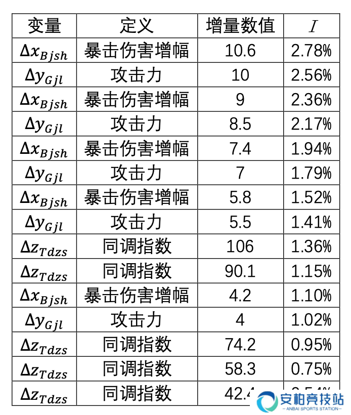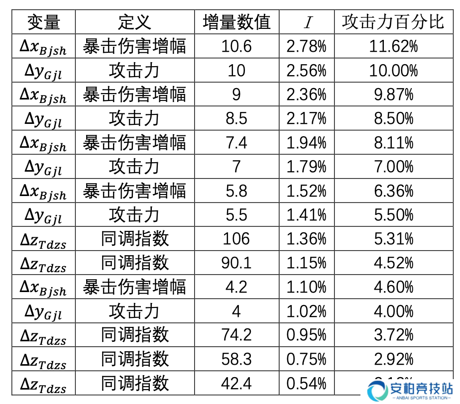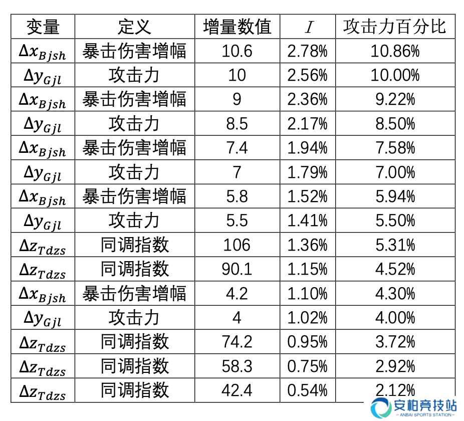 利用以上关系式,针对暴击伤害增加、攻击力、同调指数,开展进一步的量化分析。那么有: