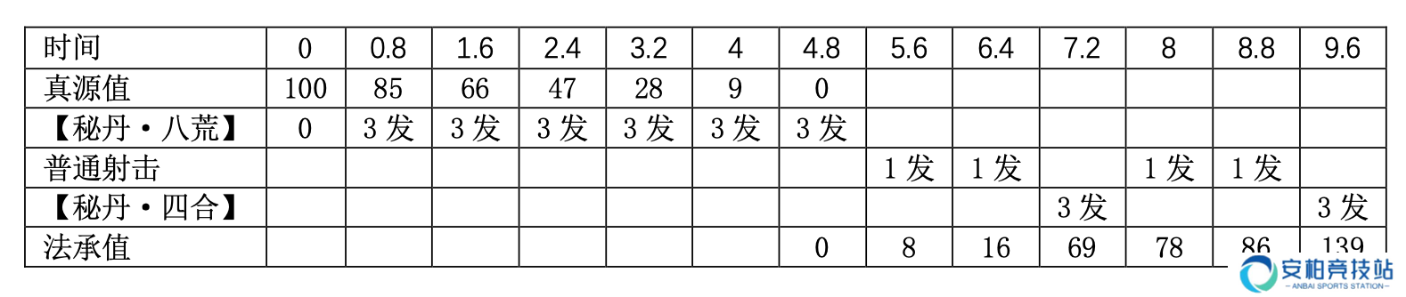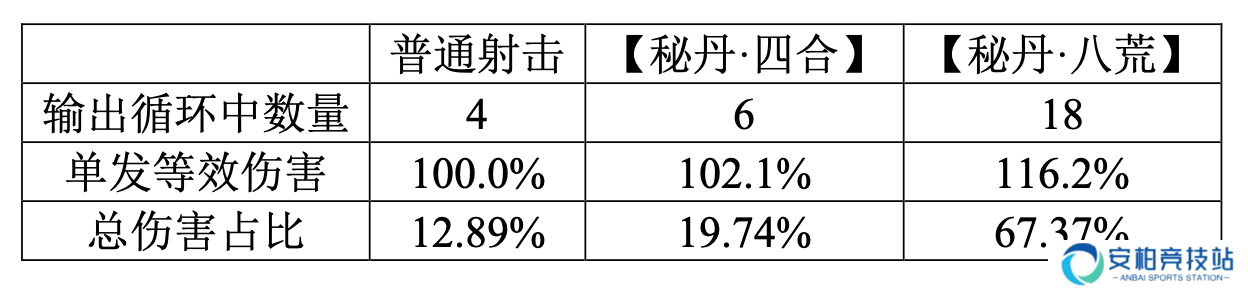 【卜卜·小天师】在长轴持续输出情况下,【秘丹·八荒】的伤害占比为67.37%,【秘丹·四合】的伤害占比为19.74%,普通射击的伤害占比为12.89%