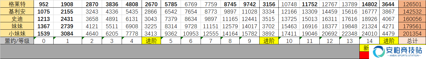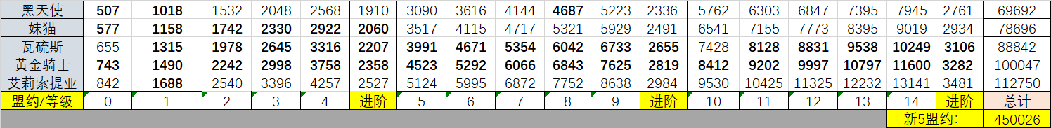 为了安排自己打地宫的计划,特地整理了全盟约各阶段所需古币及总和