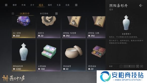 阴阳易形丹是燕云十六声推出的新道具,很多玩家不清楚这个道具多少钱,在游戏当中的售价是1280长鸣珠,玩家们可以在游戏当中的江湖百珍商店购买获得,1.6版本前注册的玩家可以免费获得一个。接下来就由小编给大家带来了详细的《燕云十六声》阴阳易形丹价格介绍!