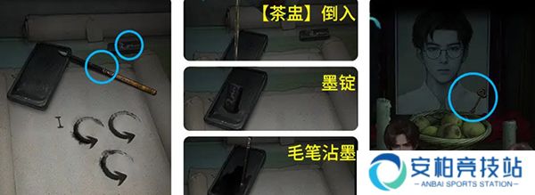 7、拾取“茶盅”,将茶水倒入砚台,研磨墨锭,使毛笔沾墨,掀开照片的红布,拾取“钥匙”。