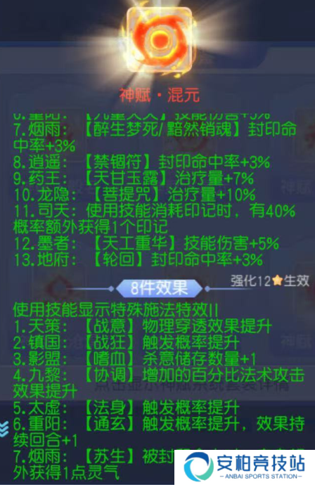 破局之关键在于烟雨阁的混元神赋。具体看其八件套效果,当被封印命中时,自身可额外获取一点灵气。现在的封印命中情况,基本上都接近100%了。一半以上的技能是肯定能命中的,剩下的一半技能命中率也在80%以上。那么烟雨阁带上混元的效果,在自己速度不占优势的情况下,可以增加灵力的获得。