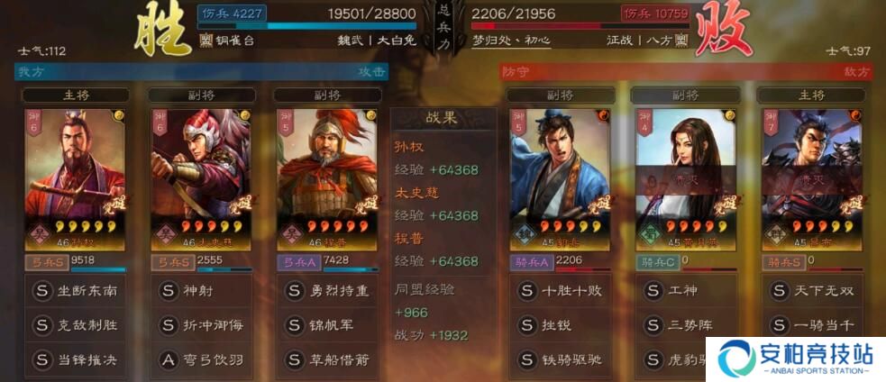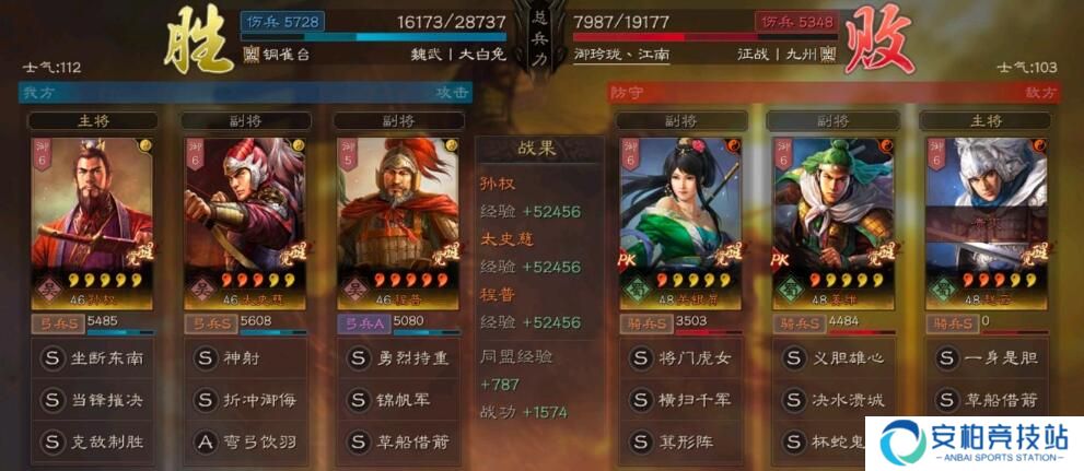 总结:整体来说这个阵容除了草船借箭比较枪手之外,其他战法基本上都不难凑,而且这个阵容的联动性比较高,尤其是克敌制胜搭配锦帆军的后,不仅输出有联动,而且还有机会打出虚弱的效果,大幅度的提高了队伍的上限!当然了,相比于兵无常势来说,这套阵容上限更高,可是却比较看脸,可以说上限和下限更高,反观带兵无常势的话则会比较稳定一些,具体情况大家根据自己的情况进行选择,没有对错之分,个人感觉也可以考虑把兵无常势给太史慈使用,提高生存能力!