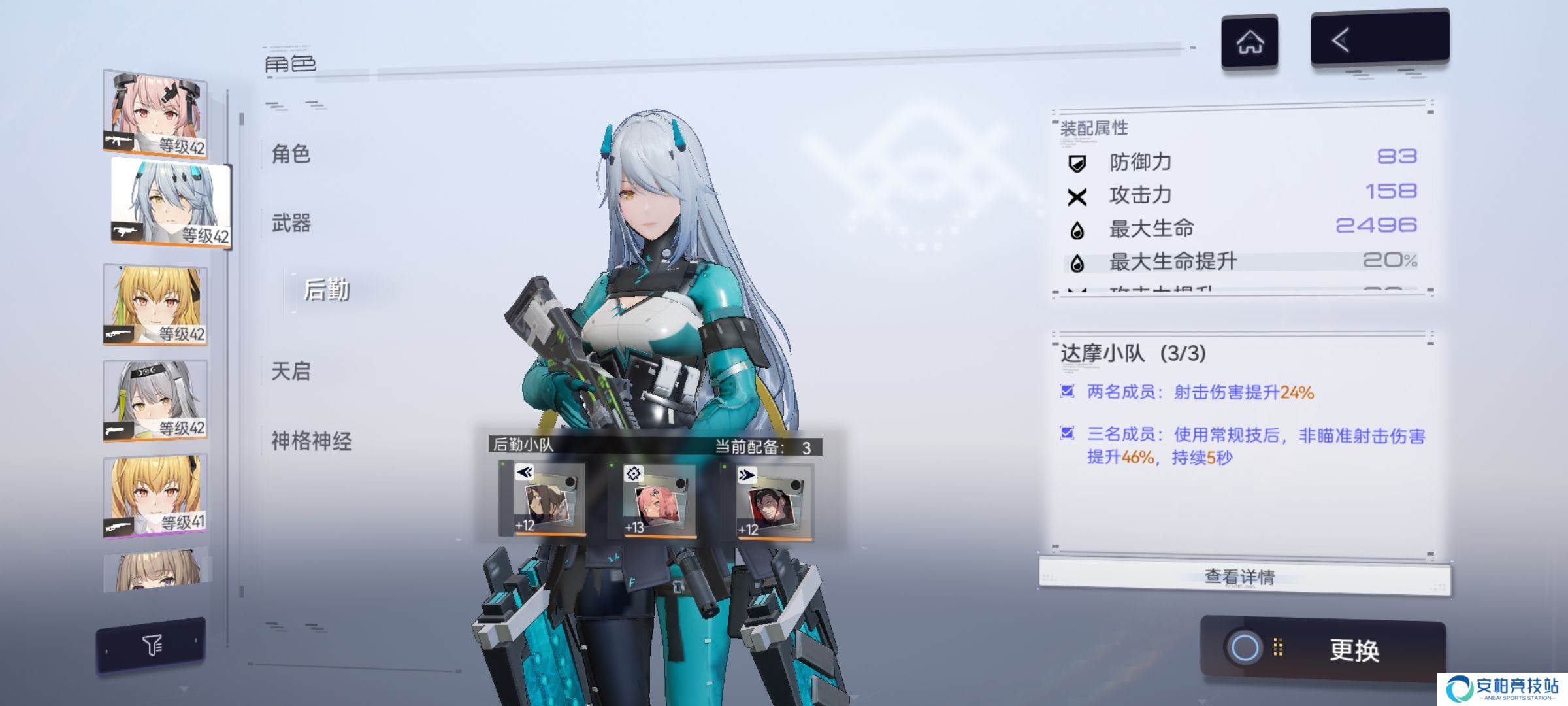 很好,这时候你已经凑齐一套三个后勤。后勤升级顺序,中右左,中间百分比加攻击肯定是最高优先级。右边百分比防御,左边百分比生命,人物生命值本来就不低,防御优先级肯定高一点。