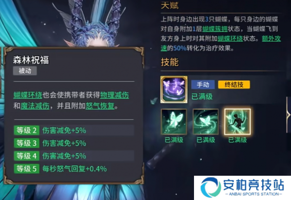 而她的被动技能“轻柔蝶翼”和“森林祝福”更是锦上添花。“轻柔蝶翼”每2秒会有50%的概率帮助队友驱散负面状态,而“森林祝福”则会赋予队友物理和魔法双重减伤效果,还能让携带“蝴蝶环绕”的单位快速恢复怒气,这也让塔露拉成为队伍中的一个怒气加油站和状态清除器。
