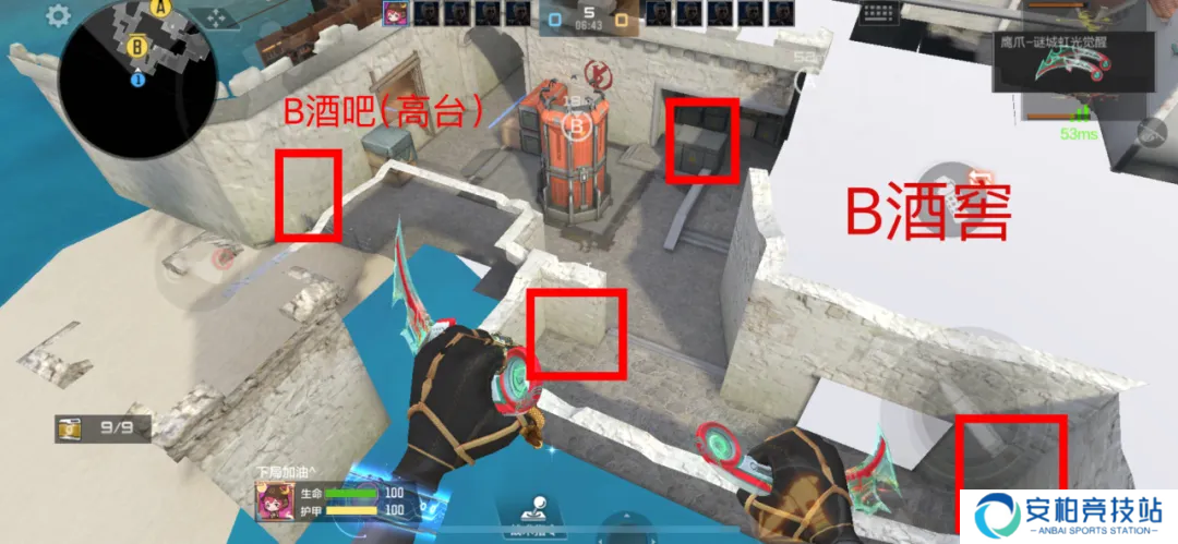 打进B包点后,守包时我们可以选择的老六点位就比较多了,如图所示,B包点有很多角落可以选择,但是我们主要讲一下B高台。