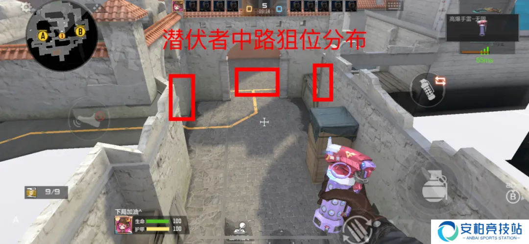 反过来看潜伏者,潜伏者中路对狙的情况和保卫者相同,除去枪法的比拼外,考验的就是道具的配合使用,潜伏者能够中门对狙的位置有三个,如下图所示,如果对狙没有把握的话就提前给高抛烟封住中路,让对方狙击手失去视野,再伺机而动。