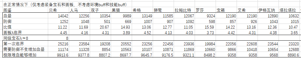 经过计算可以发现的是,几乎没有角色能够达到同等级防御宝石优于血量宝石的面板,即便在装备和前三颗宝石上费尽全力。(经过验算,目前只有白一个角色可以达到。)