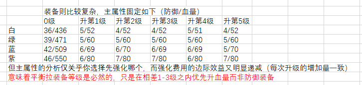 2.在普遍的情况下,往往应该先升级主属性为血量的装备而不是防御的装备,直到升级他们所需的消耗相差近一倍才升另一个。