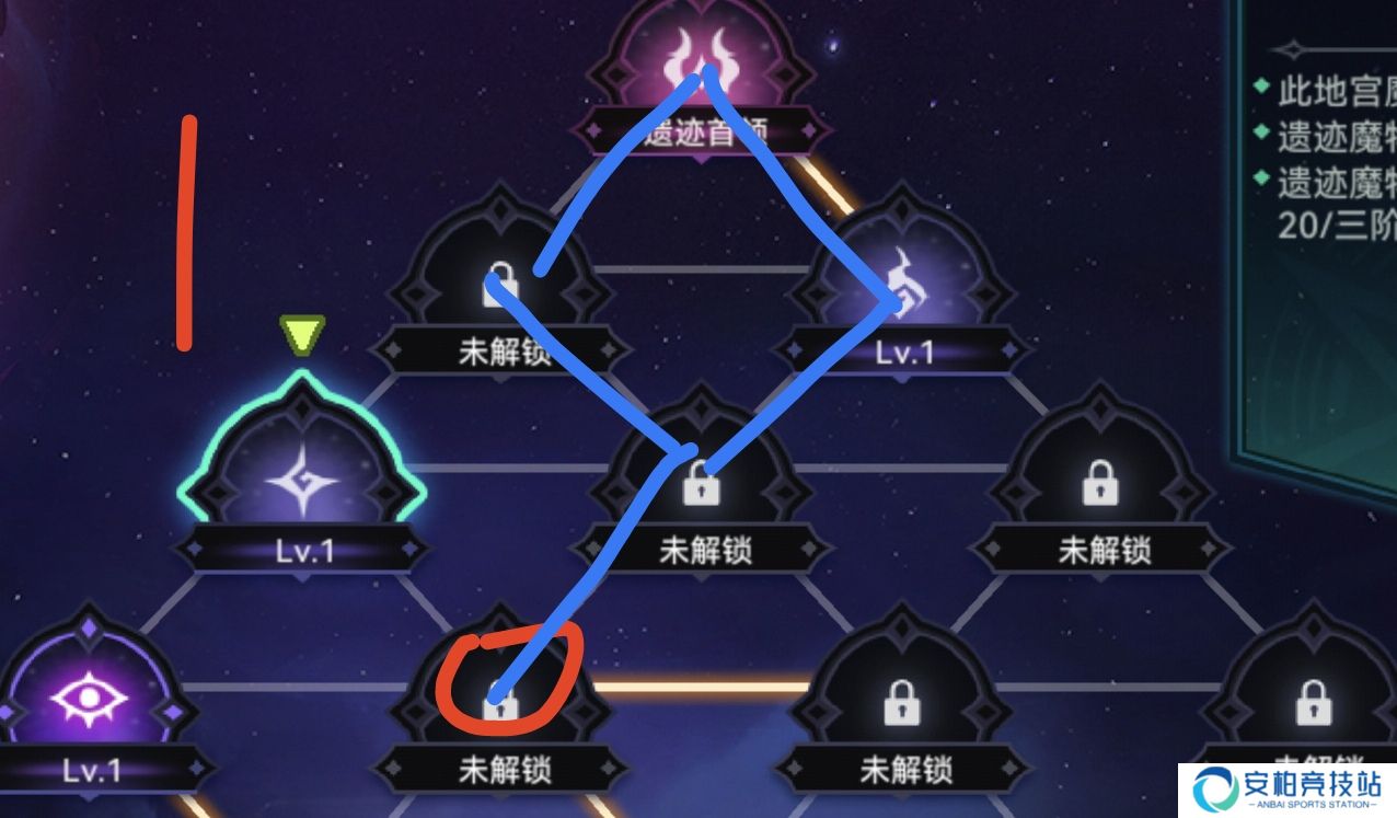 首领房和起点不刷,总共13-2=11个节点,一个必刷点,起点后面那个也就是第一个图标0的节点。作为三条路线的起点
