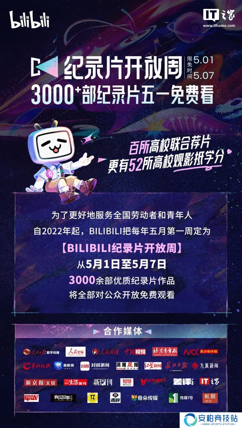 本站 5 月 3 日消息,B站宣布 2025 年五一假期开启第四届“纪录片开放周”活动,联合清华大学、北京大学、复旦大学、上海交通大学等全国超百所高校,对外免费开放3400多部纪录片作品。