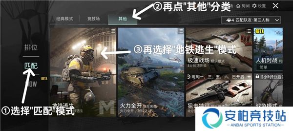 4、选择“匹配”模式,再点“其他”分类,再选择“地铁逃生”模式,点击即可进入,战栗深邃,地铁逃生。