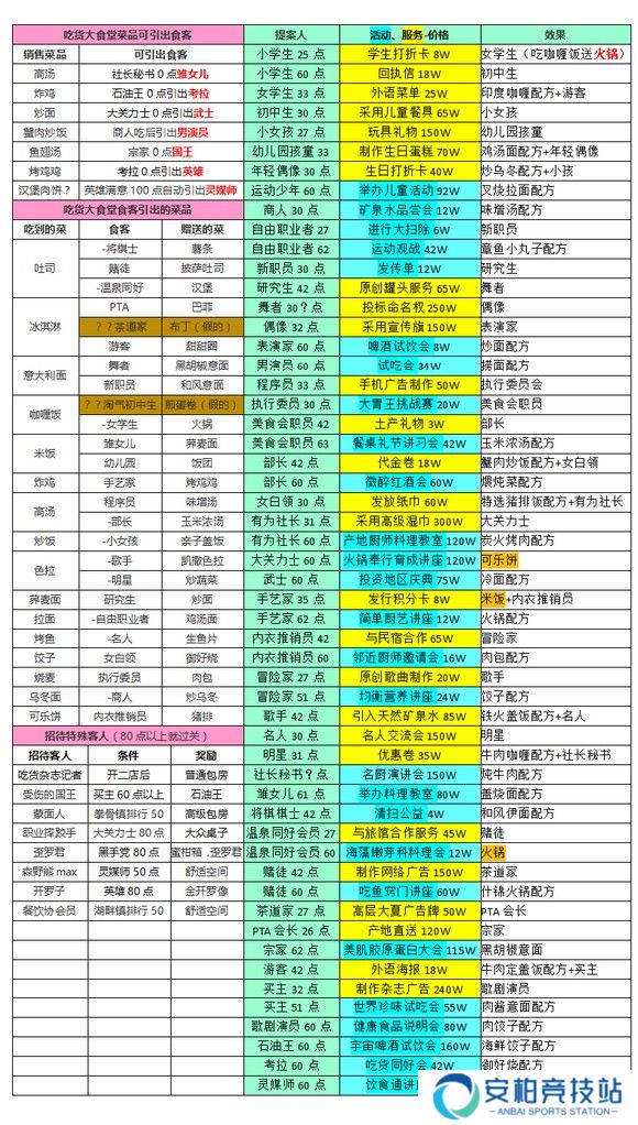 中餐开局,1年4月(开场的第一个月)跟5月接待贪吃的小学生到15以上的满意,(菜品不行最高也就到19)同时间2个晚上完成炒饭的一次开发(酱油+酱油),6月让小学生吃到120/80品质的炒饭(其实有80/70也够了),6月就拿到“学生卡”活动,马上执行。7月下午第一次探险得到“辛辣调料”,同月晚上完成炒饭+辛辣调料=咖喱饭,同一个晚上拿到活动带出的“女学生”。8月开店第一个人就是女学生,给她吃咖喱饭得到最好的中级料理火锅!!(达标的玩法是开局第11个月可以让火锅到达9500,如果你没达到这个标准那就没有后续了)