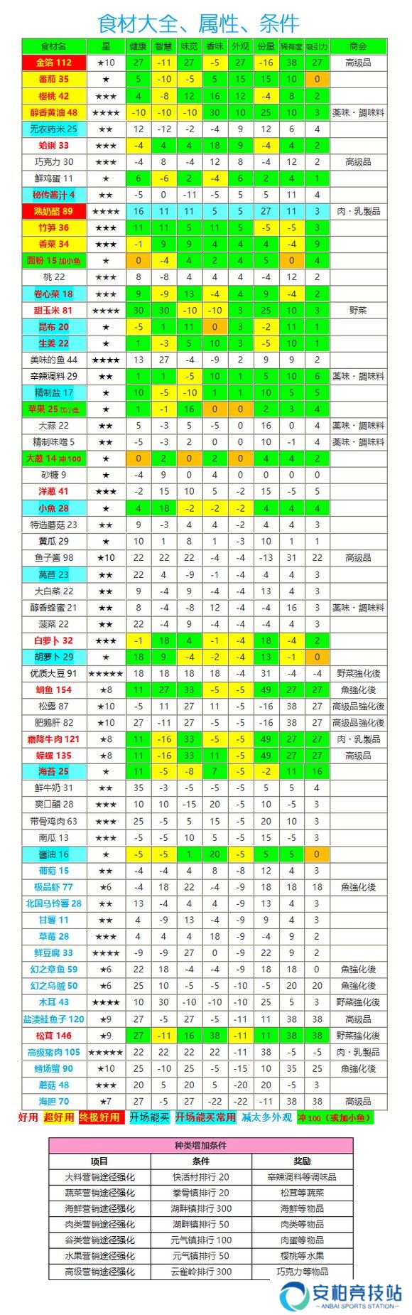 第四网上给的食材配搭都是看数据配出来的,没实践就胡说坑人的。要知道小鱼+生姜跟生姜+小鱼效果都会不一样的,比如海苔外观是-5的,竹笋是外观+5,想外观不减就要把-的放第一+的放第二)