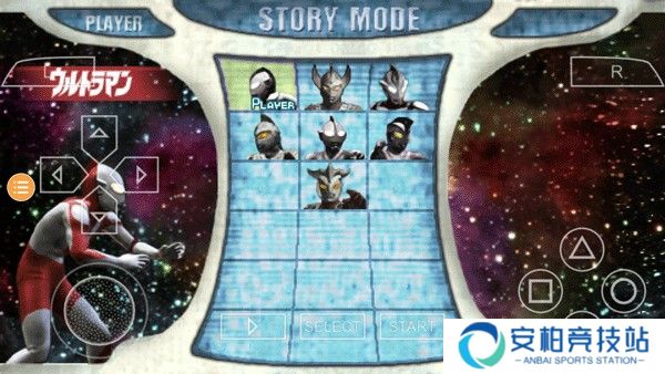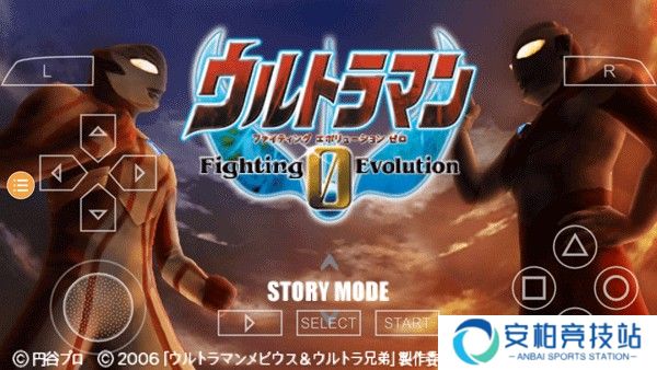 1、下载好奥特曼格斗进化0游戏后点击进入,可以看到首页,在左边的上下箭头选择模式,选好后在右边圆圈确定