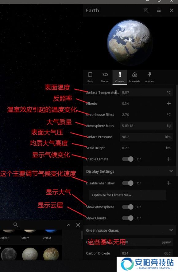 似地球的岩质行星才有的,其他行星则是Temperature选项,恒星则没有这个选项,在这里可以调节星体温度,气压,大气质量等,也可以开关气候变化(Enable Climate)由于不同种类星体的选项都不尽相同
