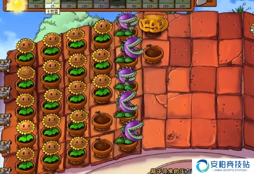8、超乎寻常的压力:关卡在阳台进行,植物的射程变短,其他都不变,多用食人花、炸弹和三叶草,给食人花上南瓜套放前排吃僵尸。