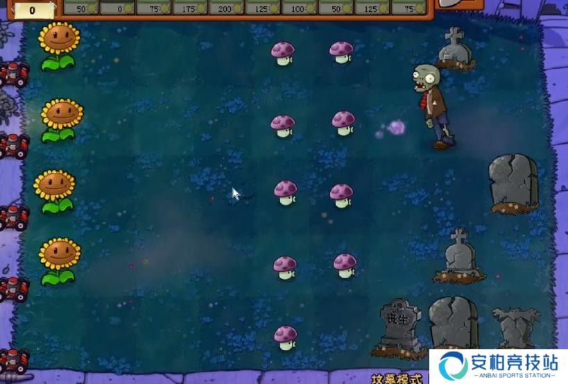 3、无草皮之地:上下两行不能种植物,但还是会有僵尸,所以需要用到6个大喷菇来打到上下两排的僵尸,上下各3个。