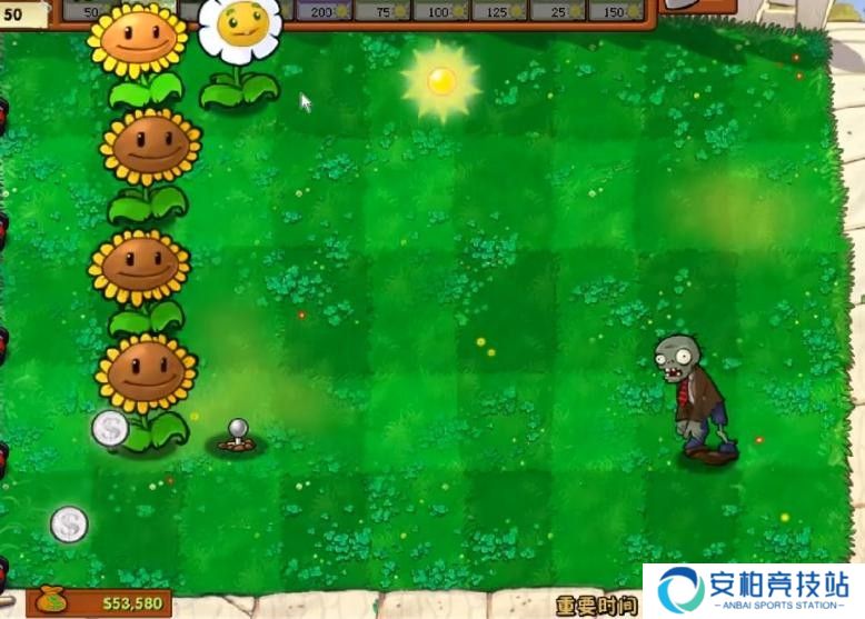2、晴天:掉落的阳光数量是平时的两倍,前期僵尸比较慢,用地雷阻挡一下,种满向日葵后再放输出植物更容易过关。