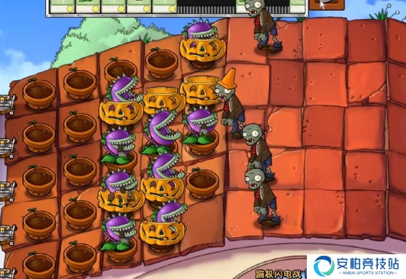 12、蹦极闪电战:与5-5关卡玩法相同,只放食人花,每排放3个就行,每个都加上南瓜套保护,多留炸弹清场。